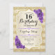 16:e födelsedagsinbjudan. Elegantens utformning i guld och lila. Funktioner faux glitter guld rand, ro snyggt, skriptteckensnitt och konetti. Perfekt för en glam-födelsedagsfest.