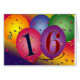 Stora färgrika ballonger med konfettiar och regnbågen färgade bakgrund med 16 i ballongerna. Den perfekta designen för din 16th födelsedagsfest favoriserar/brevskickanden.