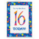 Ett ljust och färgglatt 16th födelsedagkort för en broder, med randigt numrerar och en starry gräns, från en digital design av Judy Adamson. Du kan ändra det inre meddelandet, om du önskar.