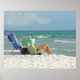 16x20 tryckfärgning av en kvinna som läser bok i en strandstol när vågar rullar in på stranden.