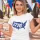 Denna roligt blå och vit unisex t-shirt har patriotiska vita stjärnor på ett blått karta i Förenade Stater. Ovanpå land står 1776. Det är en underbar design för den 4 juli!