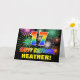 Framdelen av denna färgrika, glada och roliga födelsedagskortdesign har en stor siffra "17" och texten "GRATTIS PÅ FÖDELSEDAGEN", båda med en regnbågsspektrum-gradering som inspiration för mönstret, tillsammans med ett djärvt gult redigerbart mottagarnamn. Framsidan har också ett flerfärgat explosionsliknande fyrverkeri-inspirerat bakgrundsmönster. Insidan har ett anpassat födelsedagsmeddelande, eller kanske kan tömmas och lämnas tomt om ett meddelande ska skrivas för hand istället. Ett spännande anpassningsbart födelsedagskort som detta kan vara ett roligt sätt att fira någon på deras sjuttonårsdag.