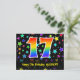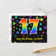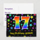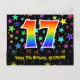 Framsidan av denna roliga, spännande och färgglada födelsedagstema postkortsdesign har en stor siffra "17" med ett regnbågsspektrum-gradering inspirerat mönster, tillsammans med meddelandet "Grattis på 17-årsdagen", och ett personligt mottagarnamn. Framsidan har dessutom ett livfullt och färgglatt bakgrundsmönster med stjärnformer i olika storlekar. Baksidan har ett anpassat födelsedagsmeddelande, eller kan kanske rensas och lämnas tomt om ett meddelande ska skrivas för hand istället. Ett sådant anpassningsbart födelsedagskort kan vara ett roligt sätt att erkänna någon:s sjuttonde födelsedag. Postkort som detta kan också användas för att inbjuda gäster till en födelsedagsfest som hålls för