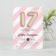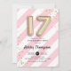 Inbjudan till 17-årsfest. Elegant design i falskt glitterguld med rosa och vita ränder. Inbjudningskort med gyllene nummer 17 ballonger, skrivstil med konfetti. Perfekt för en stilren 17-årsfirande. Kontakta mig om du behöver anpassad ålder.