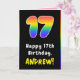 Den här uppgången och roligtens hälsningskortdesign har ett stort nummer "17" med ett multifärgad-regnbågsspektrum som inspirerar gradienten mönster, tillsammans med meddelandet "Lycklig 17:e födelsedag" och en anpassningsbar mottagare namn. Insidan innehåller ett anpassat hälsning-födelsedagsmeddelande eller kan kanske tas bort och lämnas tomt om ett meddelande ska skrivas för hand i stället. Ett glatt hälsningskort för personliger som detta kan skickas för att fira någons sjuttonårsdag. [~Z0000627]