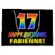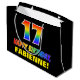 Den roliga, roligt- och färgfulla födelsedagskalematoden för presentväskan har ett stort nummer "17" och meddelandet "GRATTIS PÅ FÖDELSEDAGEN,", båda färgader med en regnbågsspektrumövertoning som inspirerade mönster, tillsammans med en fet gult anpassade mottagare namn. Bakgrunden är svart på färgad. En sådan här presentpåse på roligtens födelsedag kan användas när en gåva eller present i firande på någons 17-årsdag är ge. [~Z0000477]