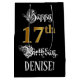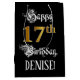 Den här opulenta och ornerade presentsäcksdesignen på födelsedagskalas innehåller budskapet "Lycklig 17:e födelsedag", plus en anpassningsbar som tar emot namn. En del av meddelandet finns i eleganten script-stil. Den stora siffran "17:e" har ett faux/imitation guld-inspirerat utseende mönster. Bakgrunden är svart på färgad. En sådan här utförlig presentväska kan användas när en gåva eller gåva är ge för att hedra någons sjuttonårsdag. [~Z0000560]