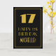 Framsidan av 1920-talet-1930-talet inspirerades av stil och vintagens högtidliga hälsningskort visar en stor konst deco stil-inspirerad nummer "17", budskapet "LYCKLIG 17:e BIRTHDAY", en personlig namn och en gräns mönster som består av linjer. Det finns en bakgrund med svart färgad på framsidan. Insidan innehåller ett anpassat hälsning-födelsedagsmeddelande eller kan kanske tas bort och lämnas tomt om ett meddelande ska skrivas för hand i stället. Ett sådant här födelsedagskort i personligen kan vara ett roligt för att erkänna någons sjuttonårsdag. [~Z0000502]