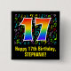 Den här roligten, den levande och färgstarka födelsedagsknappen har ett stort nummer "17" med en regnbågsspektrumövertoning som inspirerar mönster. Det innehåller också meddelandet "Lycklig 17:e födelsedag" och ett eget namn. En del av bakgrunden har ett färgstarkt musik noter och symboler mönster. Knappar som denna kan bäras av gästerna vid en födelsedagsfest som hålls för att hedra en kompositör i sång, en musiker, en sångare eller någon annans sjuttonde födelsedag. [~Z0000424]
