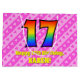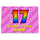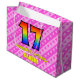 Den här lycklig och den 17:e födelsedagematoden med presentsäck har ett stort nummer "17" med ett regnbågsspektrum som inspirerar till gradient mönster. Det innehåller också budskapet "Lycklig 17:e födelsedag" och ett redigerbart namn. Bakgrunden har en rosa i mörk och ett mönster i ljusa rosa rand som innehåller levande hjärtformer i rosa. En presentpåse som denna kan användas när man slår in presenter eller ger gåvor till någon som firar sin sjuttonde födelsedag. [~Z0000414]
