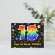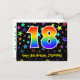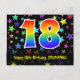 Den främre delen av denna färgglada, spännande och roliga födelsedagstema postkortsdesign har ett stort nummer "18" med ett regnbågsspektrum-gradering inspirerat mönster. Den har också meddelandet "Happy 18th Birthday," och ett anpassat mottagarnamn. Framsidan har dessutom ett livfullt och färgglatt mönster av stjärnformer. Baksidan har ett redigerbart födelsedagsmeddelande, eller skulle kunna rensas och lämnas tomt om ett meddelande ska skrivas för hand istället. Ett personligt födelsedagskort som detta kan vara ett roligt sätt att erkänna någon på deras 18-årsdag. Postkort som detta kan också användas för att inbjuda gäster till en födelsedagsfest som hålls för någon som fyller 18 år.
