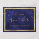 Spara datumkortet för 18:e födelsedagsfesten för en kille, man, man. En mörk blått bakgrund som är dekorerad med guldkonetti och faux guld och svart ram. Den blå färg är ojämn. Mallar för ett datum och namn/ålder 18. Golden färgad brev. Texten: Spara datumet skrivs med ett stort trendig-handskript i stil. Bakåt: utformning av vanligt vykort.