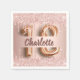 En napkin för en girig och glamorös 18:e födelsedagsfest. En ro-guld-faux-metall tittar bakgrund med faux-glitter droppar, färgdroppsutseende. Anpassa och lägg till ett namn. Namn är skrivet i mörk ro guld med ett modernt handskript i stil. Nummer 18 skrivs med ett stil-teckensnitt med ballong.