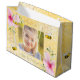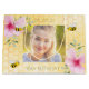 För 18:e sommarens födelsedagsfest. Gult, vit bakgrund med en bikaka mönster. Dekorerad med rosa färgad tropiska blommigtar blommor, hibiscus och lycklig humla. Lägg till ett eget foto. Mallar för datum och ålder 18. Grönt färgad brev.
