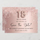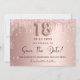 Ett giftigt och trendig Spara datumkortet för en artonde födelsedagsfest. Ro guld övertoningsbakgrund som dekoreras med droppar och stoft från ro guld och faux silver glitter. Anpassa och lägg till datum och namn/text. Texten: Spara datumet skrivs med ett stort trendig-handskript i stil. Nummer 18 med ett stil-teckensnitt med ballong.