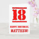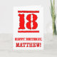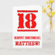 Den här roligtens hälsningskort med hälsningskort har ett stort rött nummer "18" med ett frimärke-inspirerat utseende av gummi, plus hälsning-födelsedagsmeddelandet "GRATTIS PÅ FÖDELSEDAGEN," och ett eget namn på framsidan. Insidan har ett hälsning-meddelande på personligens födelsedag, eller kan kanske tas bort och lämnas tomt om ett meddelande ska skrivas för hand i stället. Ett roligt anpassat födelsedag som detta kan användas för att fira någons artonde födelsedag. [~Z0000524]
