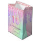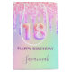 Elegant, klassisk, glamorös och feminin under 18: e födelsedagsfesten. En regnbåge, enmajsholografisk bakgrund i rosa, lila, ro guld och myntgrönt. Dekorerad med faux glitter drops, färgdroppstift. Anpassa och lägg till ett namn. Med texten: Grattis på födelsedagen. Namn är skrivet med ett modernt handskript i stil. Nummer 18 skrivs med ett stil-teckensnitt med ballong.