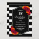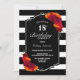 Svart och vit strimlad 18-dagars middagsinbjudan med elegant röd och orange blommigt visningar. Anpassadet är fullt ut för att du ska kunna inkludera all din egen information för födelsedagsfirandet.