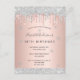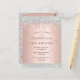 En modern, snyggt och glamorös inbjudan till 18:e födelsedagsfesten. En ro-guld-faux-metall tittar bakgrund med elegant ro guld, rosa och faux silver glitter dropp, färgdroppstift. Dekorerad med faux silver snöflingor.namn är skrivet med ett modernt grått färgad-handskript i stil. Anpassa och lägg till information om namn, ålder och party. Tips! Om du inte vill att det ska se ut som ett vykort klickar du på anpassa, går till baksidan och tar bort delaren och lägger till frimärke.