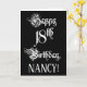På framsidan av denna opulenta och detaljerade födelseteckendesign finns meddelandet "Lycklig 18:e födelsedag" i lyxskript stil, på en svart färgad. Insidan har ett hälsning-meddelande på personligens födelsedag, eller kan kanske tas bort och lämnas tomt om ett meddelande ska skrivas för hand i stället. Ett sådant här redigerbart födelsedag i finare kan skickas för att fira någons artonde födelsedag. [~Z0000554]
