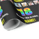 Den här roligten och den glatta födelsedagskalematerade pappra designen har ett stort nummer "18" med ett multifärgad regnbågsspektrum inspirerat gradienten mönster, tillsammans med meddelandet "18:e födelsedagen i Lycklig" och en anpassningsbar mottagare i namn. Det finns även foton som kan vara personlig, kanske med foton av mottagaren, mottagarens familj och vänner och/eller presentens avsändare. Ett härligt födelsedag som är pappert som detta kan vara ett roligt sätt att figurera en gåva eller present som ges för att fira någons artonde födelsedag. (Photography © Storytree Studios, Stanford, CA.) [~Z0000670]