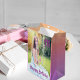 En påse för en artonårig flicka, med nummer 18 och Grattis på födelsedagen i lila. En ultraviolett, rosa och persikobaksida av färgaden. Mall för ditt foto på födelsedagstjuven och din ålder.