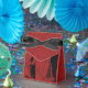 Svart silhuetter från 1920-talet i mode mot en röd gardinbakgrund med textileffekt.