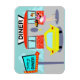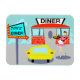 upp något speciellt med 1950 års Middag Flexi Magnet. Tecknad teckning har en röd tegelsten som bygger med blå fönster, dörrar för grått dubbla och en vit skylt som säger "Middag" på tak. I parkeringsplatsen finns ett andra tecken på en pola. Tecknet har en turkobakgrund och en blinkande röd pil som pekar ut vägen till "Don's Middag". Tecknet har gjort sitt jobb eftersom det finns en ljus gult bil med fenor parkerade bredvid den. Även om vi inte kan se dem, måste passagerarna på bilen smälla läppar. En söt, ung karhop rullar henne till bilen. Hennes brunetthår är i en bouncy ponytail. Hon bär en kort, en rosa uniform med svart trim och en vit apron. Balanserat å ena sidan bär humlen en svart bricka med en gigantisk hamburgare och ett uppfriskande gammaldags glas flaska av soda. Bakgrunden bakom middagen är teal med ljusblå moln och silhuetterna av cedar träd.