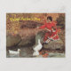 Bild som reproduceras från ett vykort på 1960-talet. Scen med mor och dotter matar anka på en damm. Djupa röda kläder, 1960-talet mode stil.