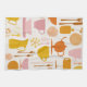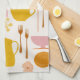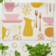 Enjoy this 1960s retro kitchen towel design, mid-century modern style, forks, teacups, plates, playful organic curves, warm vintage palette of light orange, bright yellow, and rich pink clean white background. Retro decor. Vintage decor.