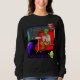 Retro Alien-kvinna i blommigt klockan grund som håller en martini i en Disco Lounge. Planeter, stjärnor och coolans galaxbakgrund.