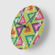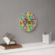 Den här väggklockan har 1970-talets utformning på koncentriska trianglar i högar av teal, orange, gult, lila och rosa på en fält av grönten.