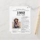 Säg grattis på födelsedagen med detta unika nyhetsbrev stil vykort, inklusive ett foto av mottagaren och en samling roligtar och världsnyheter från födelseåret 1992. Hämta kreativ och skapa en personlig keepy. Designad för att likna en vintage tidning innehåller den rubriker i personligen, text och det foto du vill ha.