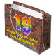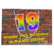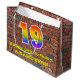 Denna roliga och färgglada födelsedagspresentväska, inspirerad av graffiti och gatukonst, har en stor siffra "19" med ett regnbågsspektrum-gradering-mönster. Den har också texten "Grattis på 19-årsdagen" och ett anpassningsbart namn. Den har också en bakgrund med ett mönster inspirerat av en tegelvägg. En födelsedagstematiserad presentväska som denna kan vara ett roligt sätt att slå in en gåva eller present som ges till någon som firar sin nittonde födelsedag.