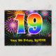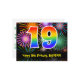 Framsidan av denna färgglada, spännande och roliga födelsedagstema postkortsdesign har en stor siffra "19" med ett regnbågsspektrum-gradering inspirerat mönster. Den har också meddelandet "Happy 19th Birthday," och ett anpassat mottagarnamn. Framsidan har dessutom ett färgglatt och livfullt bakgrundsmönster inspirerat av utseendet på sprängande firande fyrverkerier. Baksidan har ett anpassat födelsedagsgratuleringsmeddelande, eller kan kanske rensas och lämnas tomt om ett meddelande ska skrivas för hand istället. Ett anpassningsbart födelsedagskort som detta kan vara ett roligt sätt att fira någon på deras nittonde födelsedag. Postkort som detta kan också användas för att bjuda in gäster till en födelsed