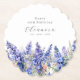 Perfekt bord-dekanor under en Juli-födelsedagsfest. Blå larkspur (delphinium) är födelseblomman för den månaden. Den bildar en söt vattenfärg grund gräns på blommigtens personlig, underlägg med skalat kant. Namn, ålder och födelsedatum för födelsedagen placeras ovanför den med hjälp av elegantens kalligrafi och typografi. All text kan redigeras.