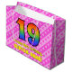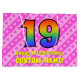 Lycklig och den uppsvällda 19:e födelsedagskalematerade presentsäcksdesignen har ett stort nummer "19" med ett mönster inspirerat av ett regnbågsspektrum. Det innehåller också meddelandet "Lycklig 19:e födelsedag" och ett eget namn. Bakgrunden har en rosa i mörk och ett mönster i ljusa rosa rand som innehåller levande hjärtformer i rosa. Sådana presentsäckar kan användas när man slår in presenter eller ger gåvor för att fira någons nittonårsjubileum. [~Z0000414]