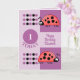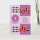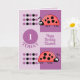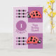 Födelsedagskort för barn. Anpassa det här födelsedagskalenderkortet med namn och ålder / 1 i dag. Provet är för ålder ett, men du kan byta till kostym. för barn för första födelsedagskort. Lila, med röda ladybuggar/ladyfåglar. Ha en underbar dag.