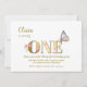 Söt guld 1:a födelsedag bjuds in med guld och nummer 1 i metallisk guld och dekoreras med rosa blommor, tillsammans med en vacker rosa-blek-fjäril sitta på E.