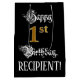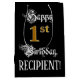 Den här opulenta och lyxiga presentsäcksdesignen för födelsedagspressar innehåller budskapet "Lycklig 1:a födelsedagen", tillsammans med en personlig som tar emot namn. En del av budskapet finns i ett ordat skript-stil, det stora talet "1st" har ett faux/imitation guld-inspirerat utseende mönster, och bakgrunden är färgadens svarta. En sådan här presentpåse på elegantens födelsedag kan vara ett respektabelt sätt att figurera en gåva eller present som ges för att fira någons första födelsedag. [~Z0000560]