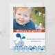 Cute-inbjudan med ett nautiskt tema. Stor grått-val, liten fisk och Fiskmås. Röd, vit och blå buntning accentuerar ett hörn. Anpassa med din text för alla åldrar.