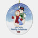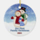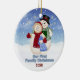 Frostig Snögubbe med fru Frosty och pojke Frosty med snöflingor bakgrund. De är utklädda till vintern i sjalv, hatt och halvton. Unik ornament har redo för datumområde som du kan anpassa.