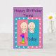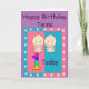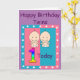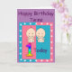 Födelsedags kort för dina speciella tvillingars första födelsedag. På framsidan finns en stor, flerfärgad siffra 1. Nedanför ettan finns två små tvillingbarn i vita blöjor och med stora leenden. Denna söta bild är i en rosa och blå ram med vita stjärnor runtomkring. Överst står orden "Happy Birthday Twins" i mörk text. Inuti kortet står orden "Wishing our special little twins a very happy birthday". Allt är i en mall som du kan ta bort eller ändra till din egen text.