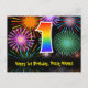 Framsidan av denna färgglada, spännande och roliga födelsedagstema postkortsdesign har en stor siffra "1" med ett regnbågsspektrum-gradering inspirerat mönster, tillsammans med meddelandet "Grattis på 1-årsdagen", och ett anpassat mottagarnamn. Framsidan har dessutom ett livfullt och färgglatt bakgrundsmönster inspirerat av utseendet på sprängande firande fyrverkerier. Baksidan har ett personligt födelsedags-hälsningsmeddelande, eller kan kanske rensas och lämnas tom om ett meddelande ska skrivas för hand istället. Ett personligt födelsedagskort som detta kan vara ett roligt sätt att skicka ett meddelande för att fira någon på deras första födelsedag. Postkort som detta kan också användas för att bjuda in g