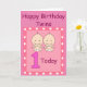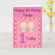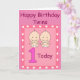 Rosa födelsedagspresentkort för dina speciella lilla tvillingflickors första födelsedag. På framsidan finns en stor siffra 1 i rosa med en lila kontur. Bredvid ettan finns två små tvillingbarn i vita blöjor och med stora leenden. Denna söta bild är i en rosa ram med vita kärlekshjärtan runtomkring. Överst står orden "Happy Birthday Twins" i mörkrosa bokstäver. Inuti står orden "Wishing our special little girls a very happy birthday". Allt är i en mall som du kan ta bort eller ändra till din egen text.