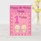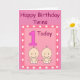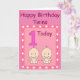 Rosa födelsedagspresentkort för dina speciella små tvillingflickors första födelsedag. På framsidan finns en stor siffra 1 i rosa med en lila kontur. Bredvid ettan finns två små tvillingbarn i vita blöjor och med stora leenden. Denna söta bild är i en rosa ram med vita hjärtan runtomkring. Överst står orden "Happy Birthday Twins" i mörkrosa bokstäver. Inuti står orden "Wishing our special little girls a very happy birthday". Allt är i en mall som du kan ta bort eller ändra till din egen text.
