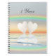 Anteckningsbok med min digitala design av två pappershjärtan som flyter på vattnet under en regnbåge. Anpassningsbar text säger "1 år".
