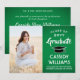 Dela glädjen av en gymnasie- eller högskoleexamen med dessa anpassade fotogröna, vita och svarta kallelser. (TIP FÖR PLACERING AV BILD: Ett enkelt sätt att centrera en bild exakt som du vill är att beskära den innan du laddar upp den till Zazzle-webbplatsen.) Den här mallen är enkel att anpassa med valfri formulering, till exempel detaljer om festinbjudan, föräldrarnas namn, särskilda utmärkelser, examensinriktning, favoritcitat, kontaktinformation för examen, framtida utbildningsplaner eller ny jobbtitel. Om det finns någon text som inte önskas, raderas den helt enkelt. Designen har en grön ombre-bakgrund, svart mortarboard-mössa, handskriven stilspråkskalligrafi, elegant modern typografi och ett foto som du väljer, till exempel en seniorbild eller bild från examensceremonin. Dessa eleganta examensannonser är ett stilfullt
