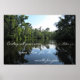 Vackra flodscen med gröna reflektioner på banker och blå himmel. Bibelns tröst är: "Gnugga allt du bryr dig om honom, för han tar hand om dig. 1 Peter 5:7"