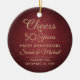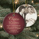 Cheers och Lycklig-årsdagen! Fira varje år på bröllop-årsdagen med en anpassningsbar fotoröd och guld runt keramiska prydnadsämnen. Bild, antalet år, parets namn och giftermål-datum på den här mallen är alla enkla att anpassa. Utformningen har en burgundisk faux-bakgrund för borstad metall, vintage art deco stil-typografi, elegant-skriptcalligrafi och ett foto efter eget val. Den här snyggten ger dagens prydnadsföremål en elegant vid dekorationerna i julhuset och ger en unik Julafton-presentidé. Observera att guld är tryckt på färg, inte metallfolie. Exempelbilden är av Tim Stagge (Källa: @tim_stagge on Unsplash).